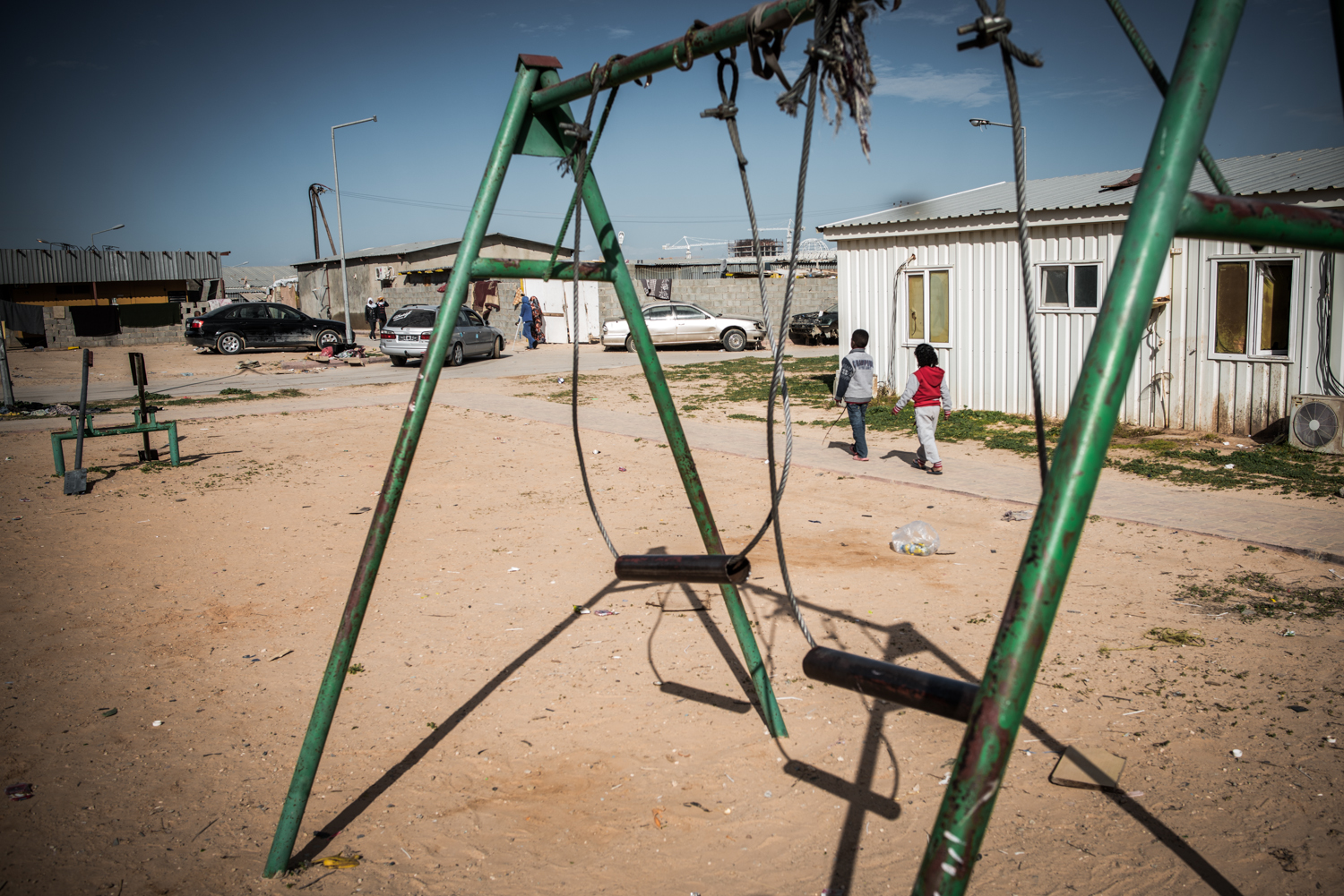 Despite the attempts of supervisors to cheer up the children with some toys to the camp, swings are still empty