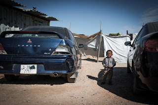 طفل تاورغي يلعب بين سيارات تفا جاء بوجودي، نظرة البحث عن الأمن قد تكون نظرة يومية، و خيام ومساعدات اليونيسيف في الخلفية