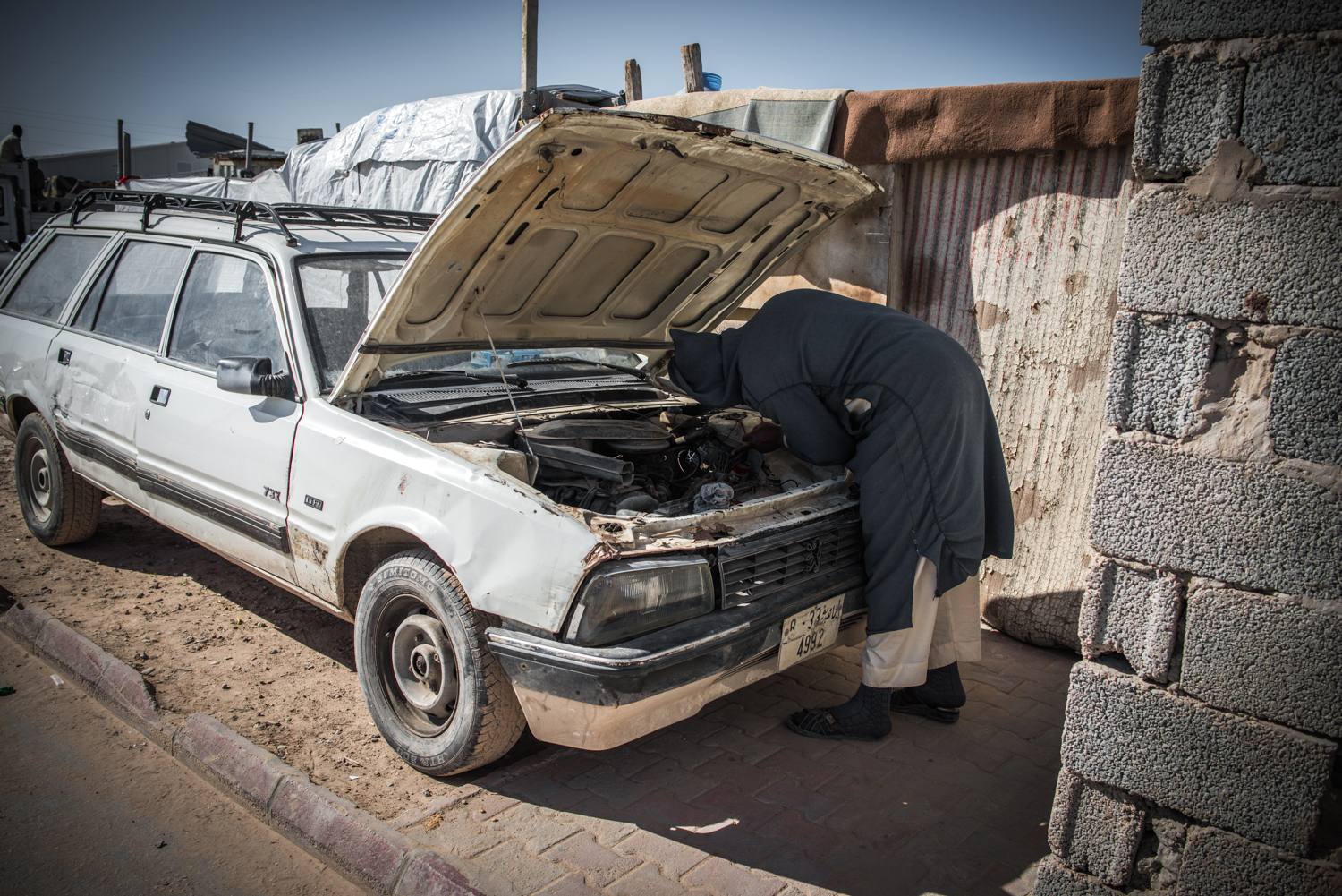 Refugee trying to repair his old car, the only communication tool with the outside world